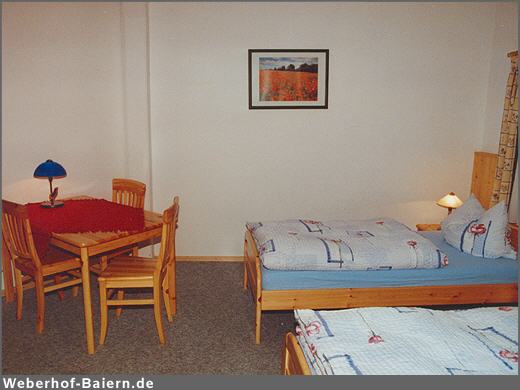 Betten und Tisch einer Ferienwohnung