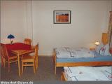 Betten und Tisch einer Ferienwohnung im Weberhof